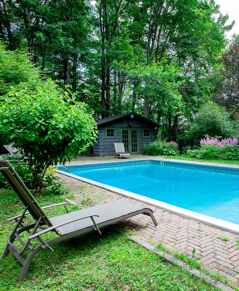 Perched atop a ridge overlooking the Manor and offering enchanting panoramic lake and forest views, the 1400 square foot Heron Suite at Manoir Hovey in North Hatley, Quebec, is equipped with two bedrooms and two bathrooms, two fireplaces, a hot tub, and private in-ground heated pool. The suite boasts a private lighted stairway down the bluff to the main entrance of the Manoir and its own landscaped grounds.